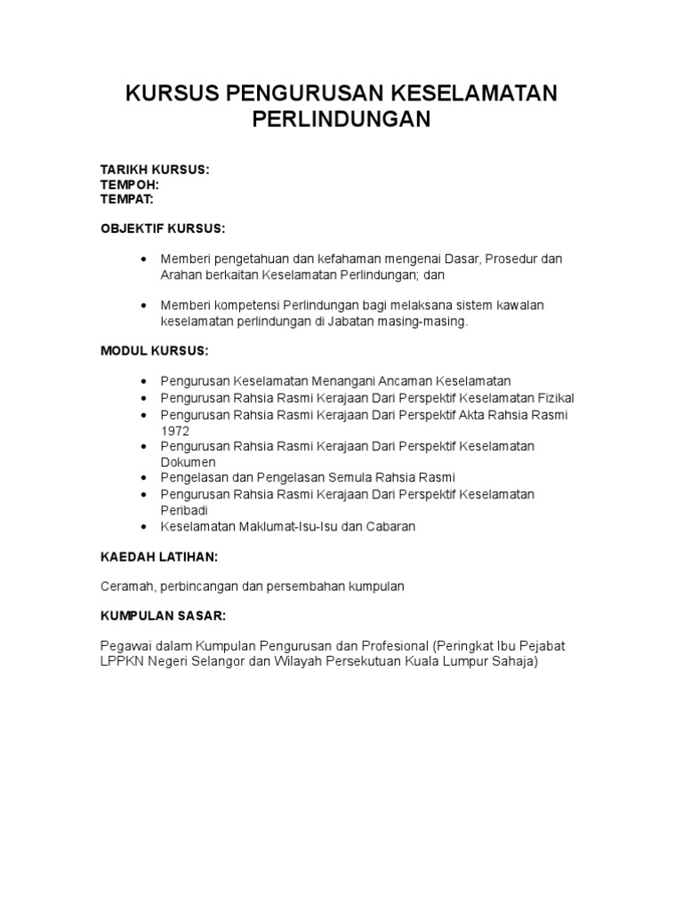 Objektif Kursus Keselamatan Di Tempat Kerja - Kesehatan dan keluarga) serta implementasi program.